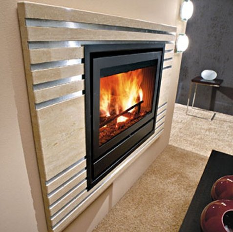 Каминная рамка из полированного бежевого Травертина с деталями из матовой нержавеющей стали.